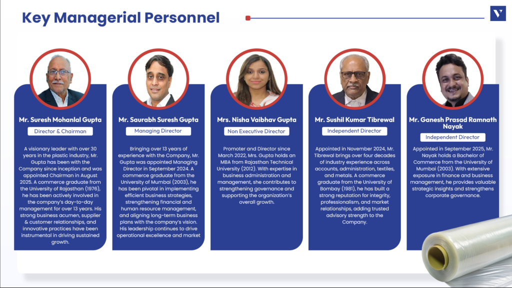 Driven by passion for building an integrated brand, backed by their 3 decades of experience in plastic industry, our promoters Mr. Suresh Gupta, Mr. Vaibhav Suresh Gupta and Mr. Saurabh Suresh Gupta play a pivotal role in shaping the strategic direction and overseeing the operations of our company and have built the values system of our Company. Their in-depth industry knowledge provides us with a significant competitive advantage, enabling us to expand our presence in existing markets, tap into new opportunities, and explore avenues for continued growth. With their experience and progressive thinking, we aim to continue grow in the Woven Sack Industry. Our Promoters have been the main thrust behind the Company’s recognition as the established brand in the industry.